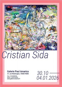La doar o săptămână după vernisajul de la Timișoara, pe 30 Octombrie, Cristian Sida a deschis o nouă expoziție personală la Galerie Paul Amarica din Paris, un spațiu consacrat artei contemporane europene, aflat în apropiere de Champs-Elysées. Artistul român expune pentru a doua oară. Expoziția va rămâne deschisă până pe 4 Ianuarie 2026. „Parisul e un spațiu care te obligă la rigoare, dar și la autenticitate. Nu poți minți în fața unui public care a văzut totul. Acolo, gestul trebuie să fie esențial, sincer, fără pretenții”, spune Sida.