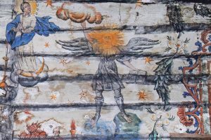 În biserica de lemn din Desești, o semilună navighează ca o bărcuță pe o apă presărată cu stele. Pe ea stă întins un bărbat, deasupra căruia plutesc două figuri: una dintre ele ține în mână o stea, cealaltă un toiag. La biserica din Rogoz, un cap de cal din lemn, aflat la capătul unei grinzi a acoperișului, poartă pe piept și pe frunte un simbol astral. La Șurdești, o ființă umană înaripată, cu un soare drept chip, arată cu degetul spre un nor, iar în cealaltă mână ține o carte. Cu acest „om solar” ne mai întâlnim de două ori: o dată la Plopiș, în mijlocul unei scene cu Sfântul Ilie și carul său de foc, și o dată la Rogoz, unde este însoțit de o creatură monstruoasă cu multe capete, care amintește de câinele infernului din mitologia greacă…